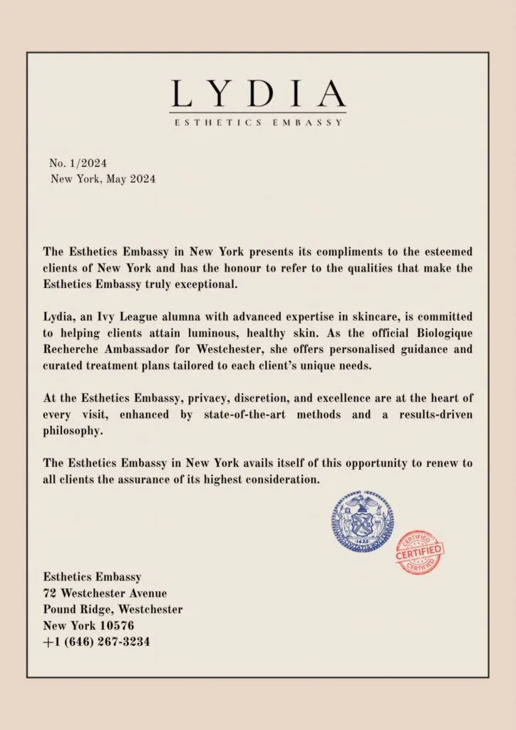 “I came from Chicago to Katonah for a facial with Lydia, and it was worth every mile. My deep-cleaning and oxygen facials were transformative, leaving my skin rejuvenated and visibly clearer. Lydia only uses the best—Biologique Recherche products and the Raja Medical OxyLight device—and it shows in the results. The care and expertise she brings to her treatments are unmatched. If you’re looking for world-class skincare in a welcoming studio, Esthetics Embassy is the place.”